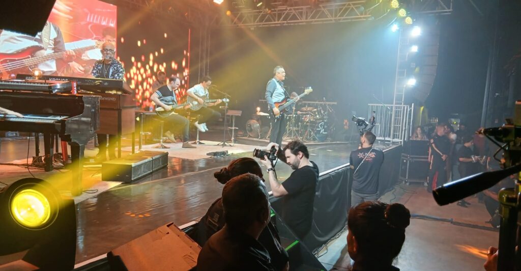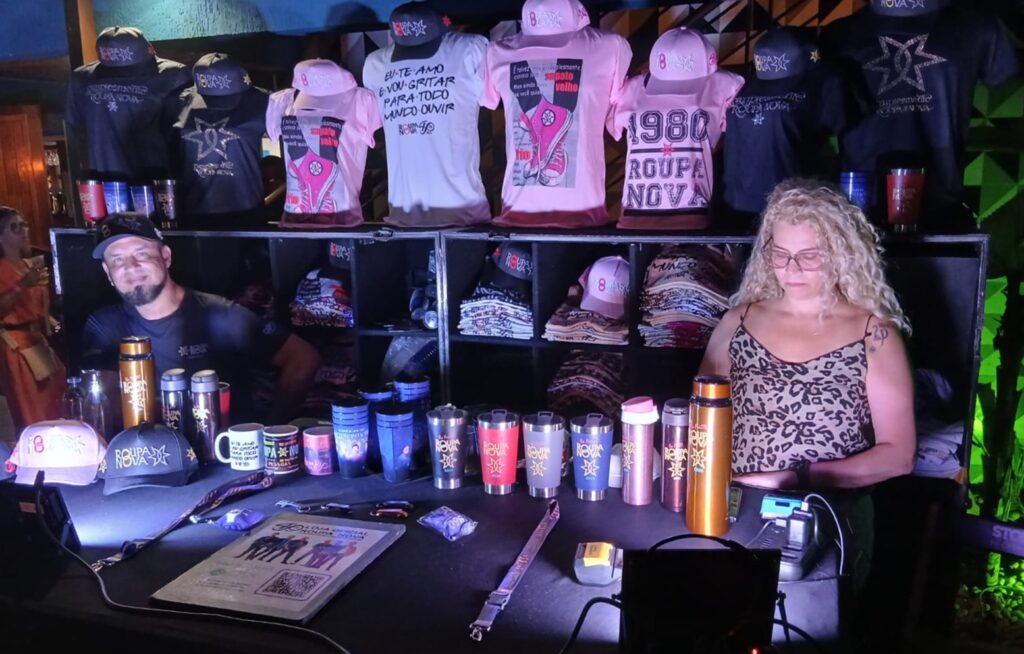 Em seu rasante, o drone da coluna focalizou o ponto de vendas de artigos personalizados do Roupa Nova, montado na entrada da Casa.