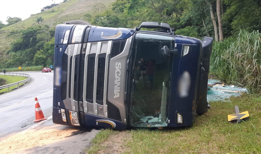 Carreta carregada com vidros tomba na BR-116 em Leopoldina e motorista sai ileso