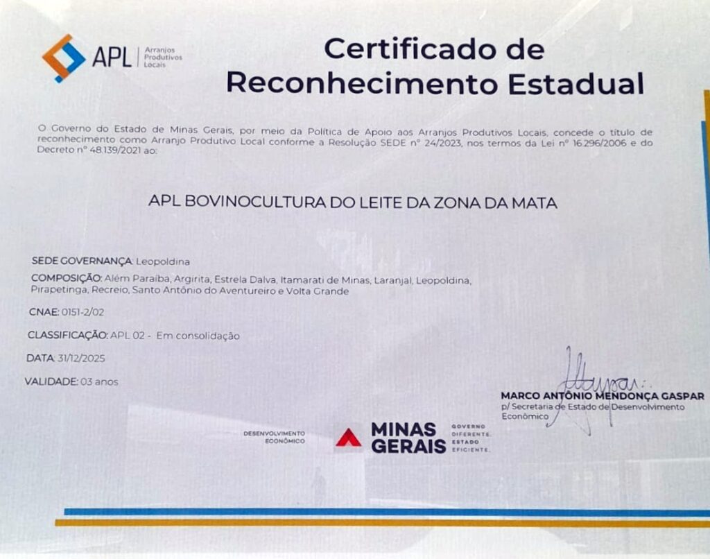 A visita integra as iniciativas do Governo de Minas para fortalecer os Arranjos Produtivos Locais, ampliar a competitividade regional e promover o desenvolvimento econômico sustentável. O APL da Bovinocultura do Leite da Zona da Mata tem Leopoldina como sede de governança e reúne municípios como Além Paraíba, Argirita, Estrela Dalva, Itamarati de Minas, Laranjal, Pirapetinga, Recreio, Santo Antônio do Aventureiro e Volta Grande.