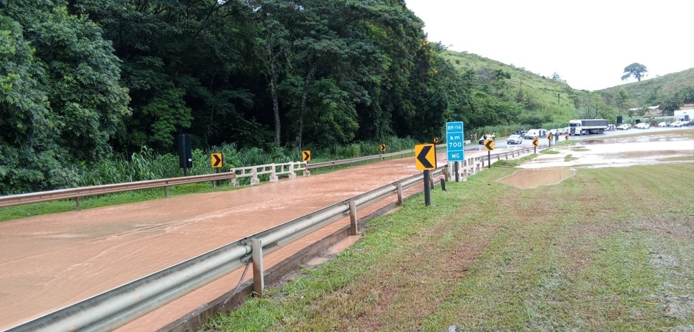 Já na BR-116, km 700, em Muriaé, foi registrado um ponto de alagamento, que causou retenção de veículos e lentidão nos dois sentidos da rodovia. Apesar disso, o trânsito segue fluindo, ainda que em baixa velocidade. De acordo com relatos, o nível da água apresenta redução gradual, indicando melhora progressiva da situação.