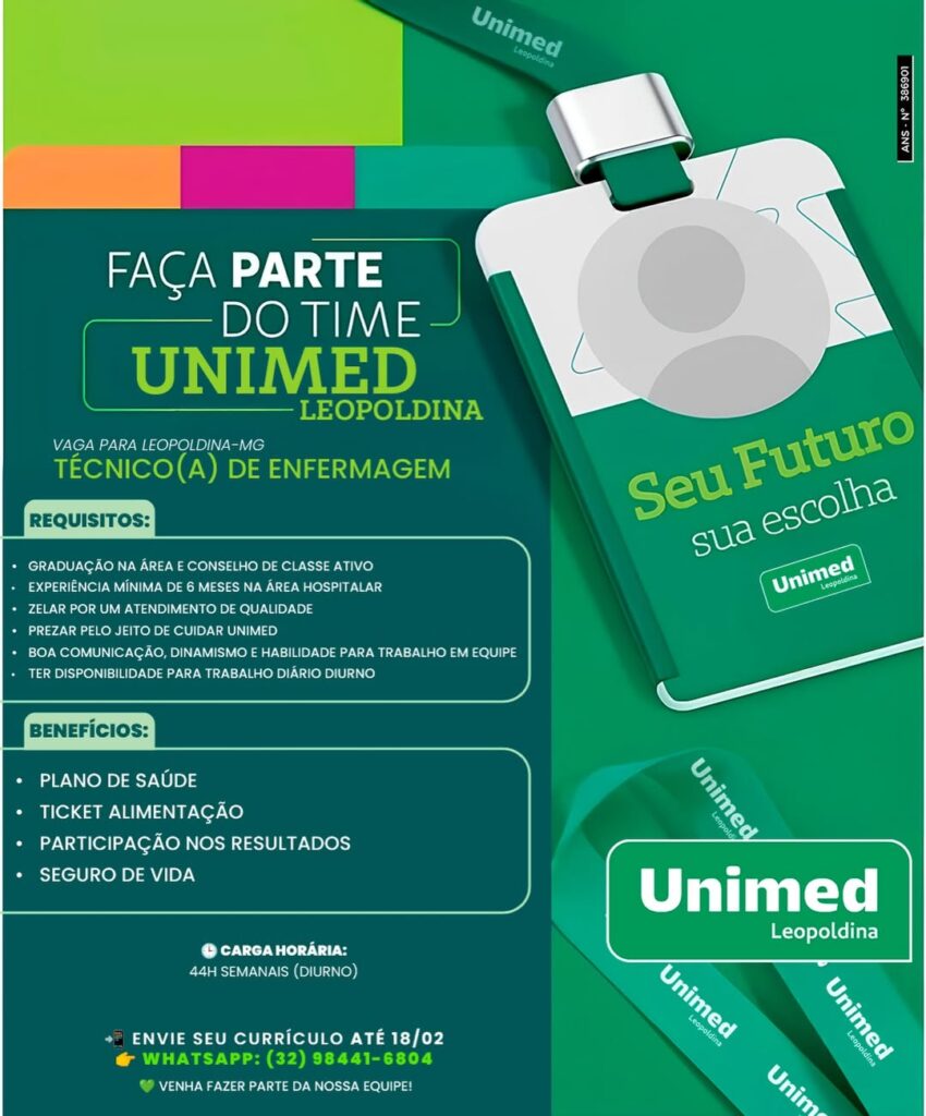 A Unimed Leopoldina está com oportunidade aberta para o cargo de Técnico(a) de Enfermagem, com atuação no município de Leopoldina. A vaga é destinada a profissionais com formação na área e experiência hospitalar.