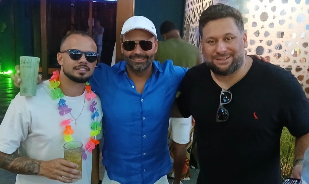 O carioca Tiago ao lado do empresário Ricardo Barros Mendes e do gerente geral da Stone House, Lucas Souza.