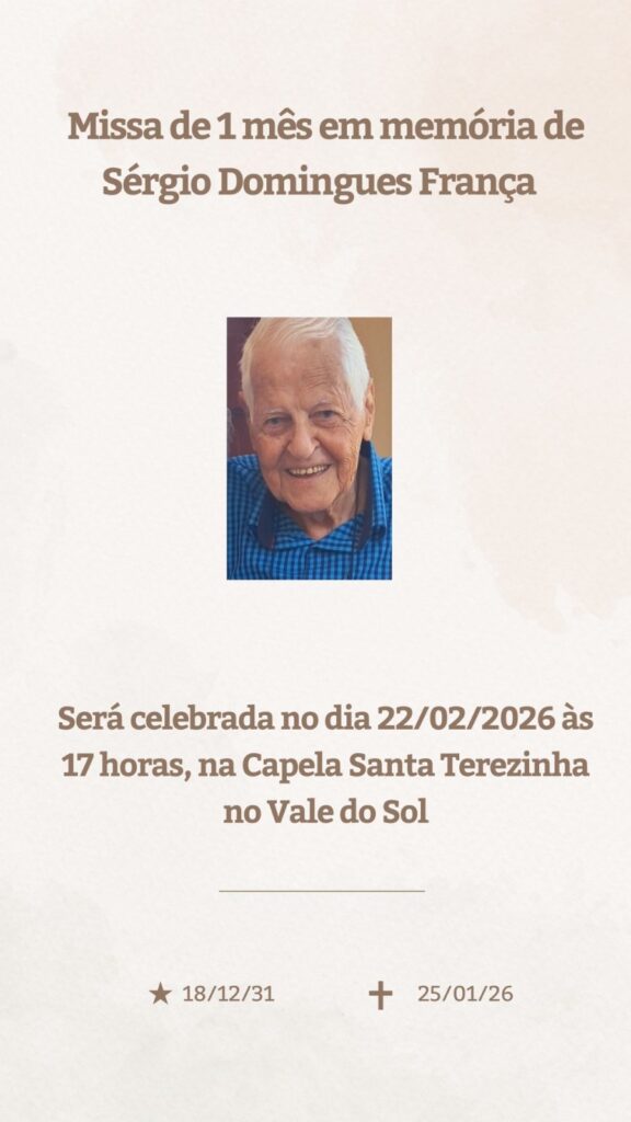 Maninhos e maninhas, obrigado pelo carinho de todos vocês. Neste domingo, dia 22 de fevereiro, será celebrada a Missa de mês em memória do meu querido pai, Sérgio Domingues França. Muito obrigado, em nome da nossa família, pelo apoio e carinho recebidos. Até logo mais, 17h, na Capela Santa Terezinha, no Bairro Vale do Sol.