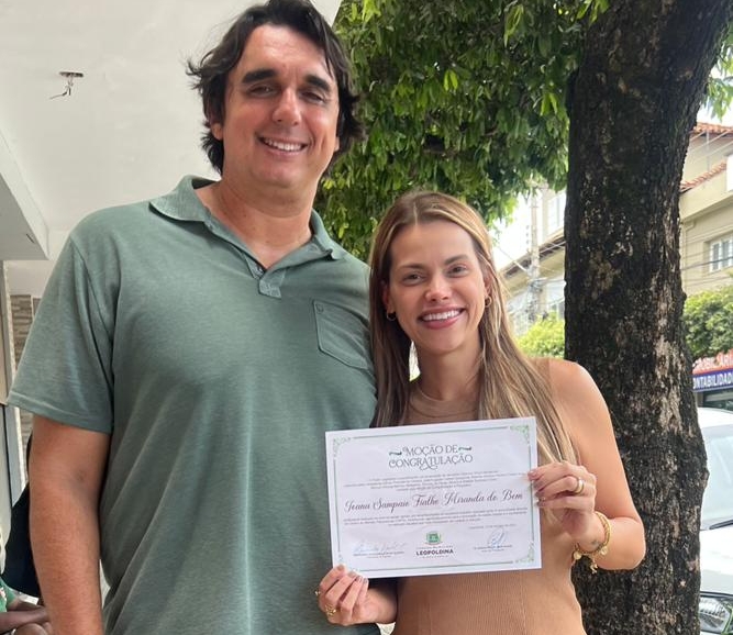 A recreiense Dra. Joana Sampaio Fialho Miranda do Bem, filha do casal Dr. Oninho e Mariângela, recebeu no último dia 12 de fevereiro uma Moção de Congratulação da Câmara Municipal de Leopoldina, de autoria do vereador Oldemar Montenari, em reconhecimento ao excelente trabalho realizado junto à comunidade leopoldinense, através do Centro de Atenção Psicossocial (CAPS).