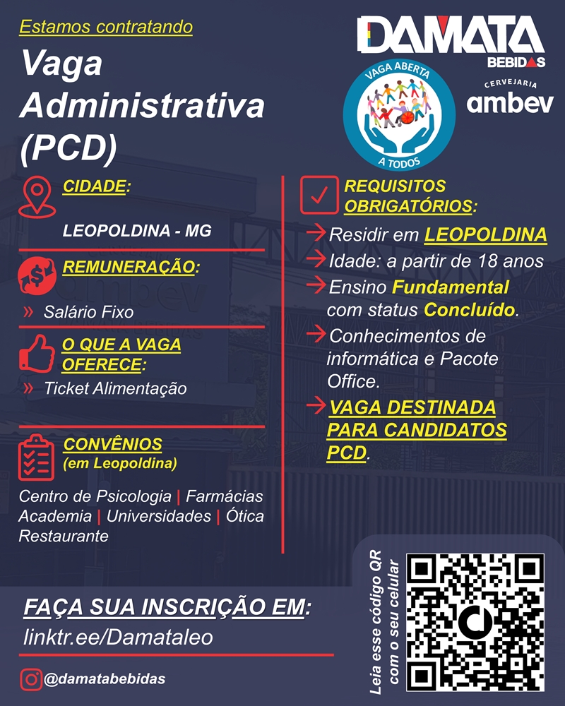 A Damata Bebidas, parceira da Ambev, está com vaga aberta para o cargo administrativo destinada exclusivamente a Pessoas com Deficiência (PCD), no município de Leopoldina.