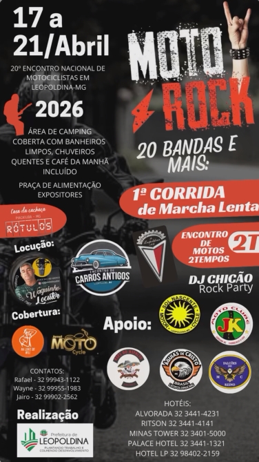Leopoldina será palco de um dos maiores eventos da região: o Motorock 2026 – 20º Encontro Nacional de Motociclistas, que acontece entre os dias 17 e 21 de abril, reunindo apaixonados por motos, rock e cultura sobre duas rodas.