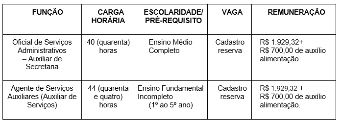 As vagas são para os cargos de Oficial de Serviços Administrativos (Auxiliar de Secretaria) e Agente de Serviços Auxiliares (Auxiliar de Serviços). Os interessados têm até o dia 17 de abril para realizar a inscrição.