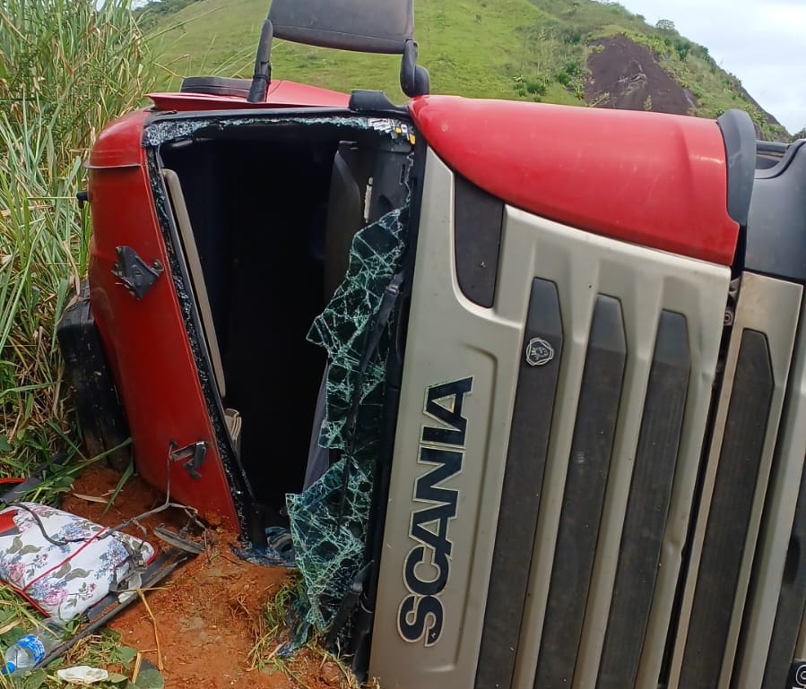 Uma carreta Scania tombou na BR-116, em Leopoldina, na região conhecida como Bica D’Água, neste sábado, 11 de abril.