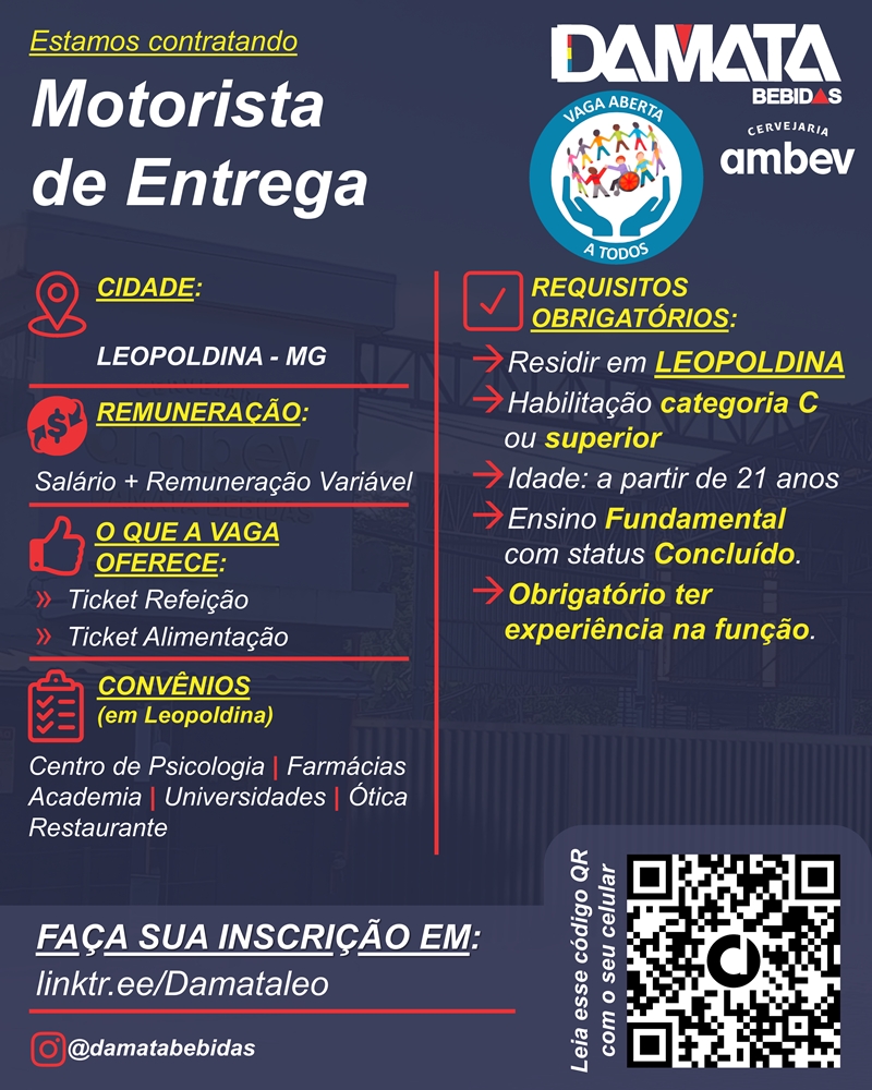 A empresa Damata Bebidas está com vaga aberta para motorista de entrega em Leopoldina. A oportunidade é voltada para candidatos que residam no município, tenham idade mínima de 21 anos, ensino fundamental completo e habilitação na categoria C ou superior, além de experiência comprovada na função.