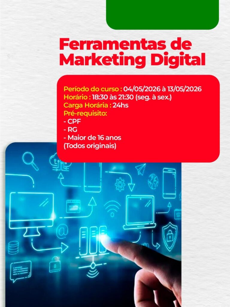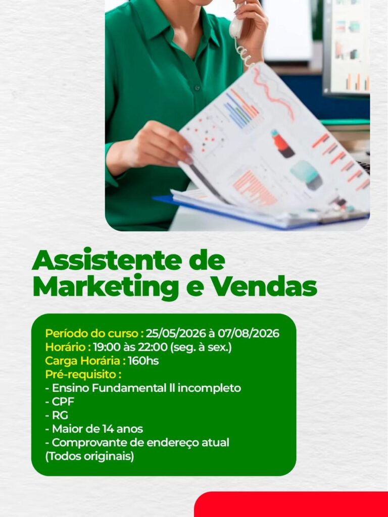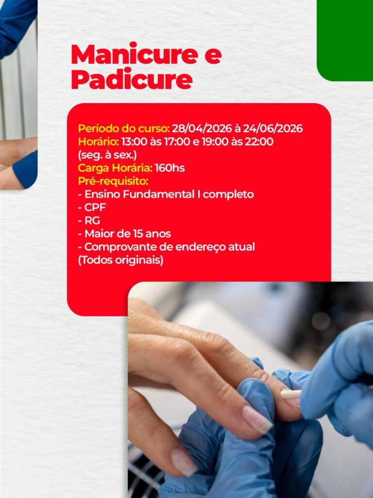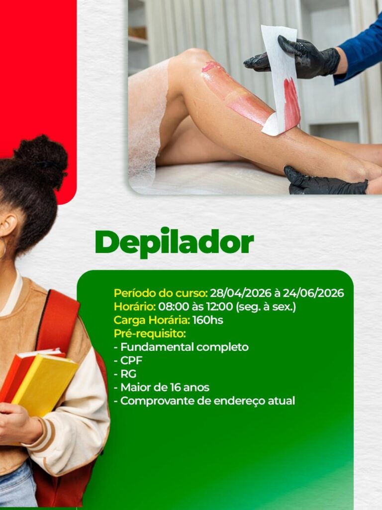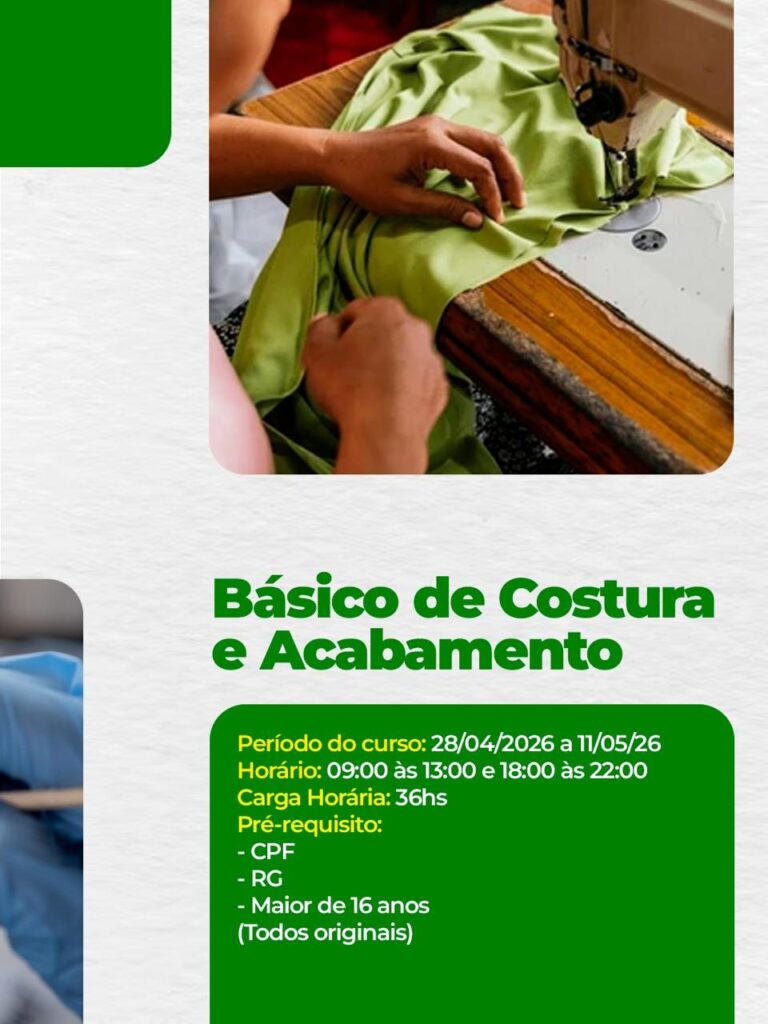 Entre os cursos disponíveis estão: Depilador, com aulas entre os dias 28 de abril e 24 de junho; Básico de Costura e Acabamento, de 28 de abril a 11 de maio; Manicure e Pedicure, também entre 28 de abril e 24 de junho; Ferramentas de Marketing Digital, de 4 a 13 de maio; e Assistente de Marketing e Vendas, com início em 25 de maio e término previsto para 7 de agosto.