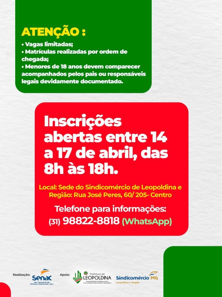 As inscrições devem ser realizadas presencialmente entre os dias 14 e 17 de abril, das 8h às 18h, no Sindicomércio Leopoldina, localizado na Rua José Peres, nº 60, sala 205, no Centro da cidade.