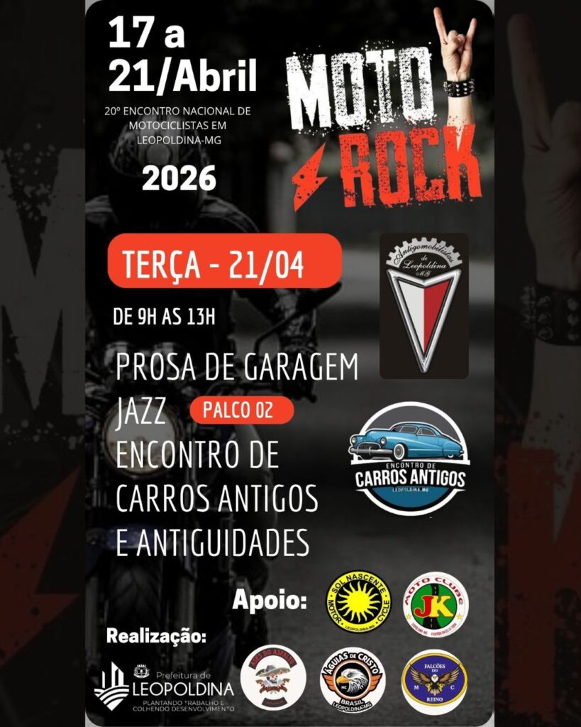 O Motorock 2026, em Leopoldina, contará com uma atração especial que promete encantar o público: a participação dos Antigomobilistas de Leopoldina com uma exposição de carros antigos na Praça Félix Martins, na próxima terça-feira (21).