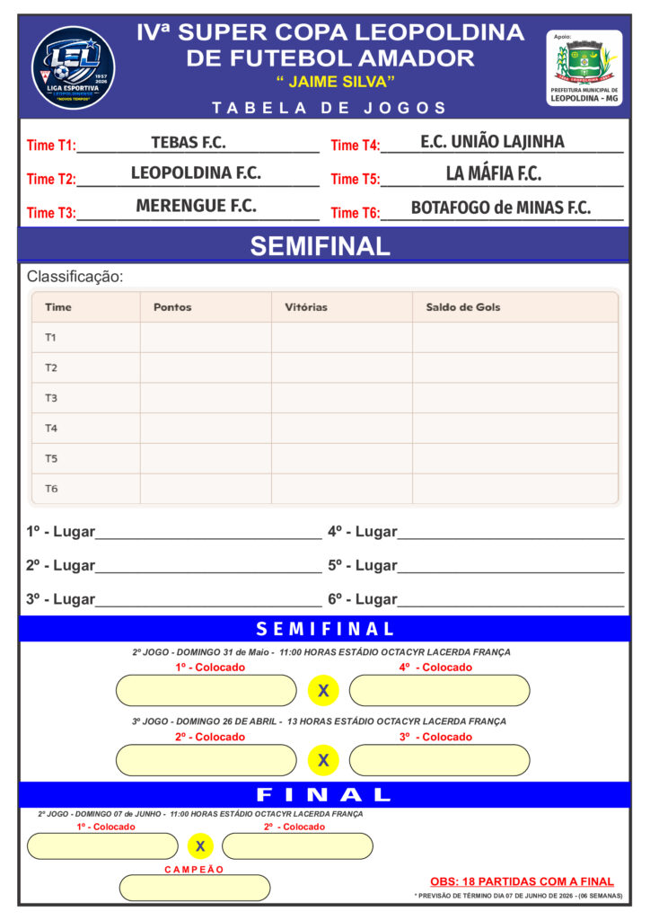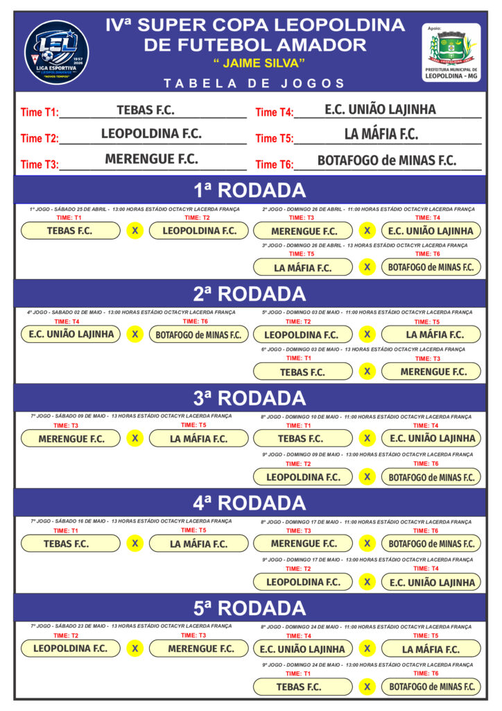 A cidade de Leopoldina se prepara para o início da IV Super Copa Leopoldina de Futebol Amador “Jaime Silva”, competição que promete movimentar o cenário esportivo local nas próximas semanas. Organizado pela Liga Esportiva Leopoldinense (LEL), o torneio contará com a participação de seis equipes e um total de 18 partidas, incluindo a grande final.